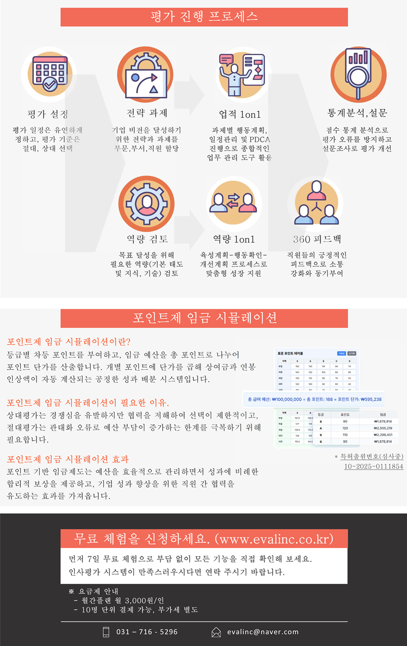 Eval 인사평가 시스템은 인사평가와 관련된 모든 기능이 포함되어 있고, 기업과 직원 모두의 성장을 지원하도록 구성되어 있으며, 저렴한 비용으로 기업의 부담을 덜어 드립니다. 특히, 포인트제 임금제도는 Eval 인사평가 시스템만의 장점입니다.